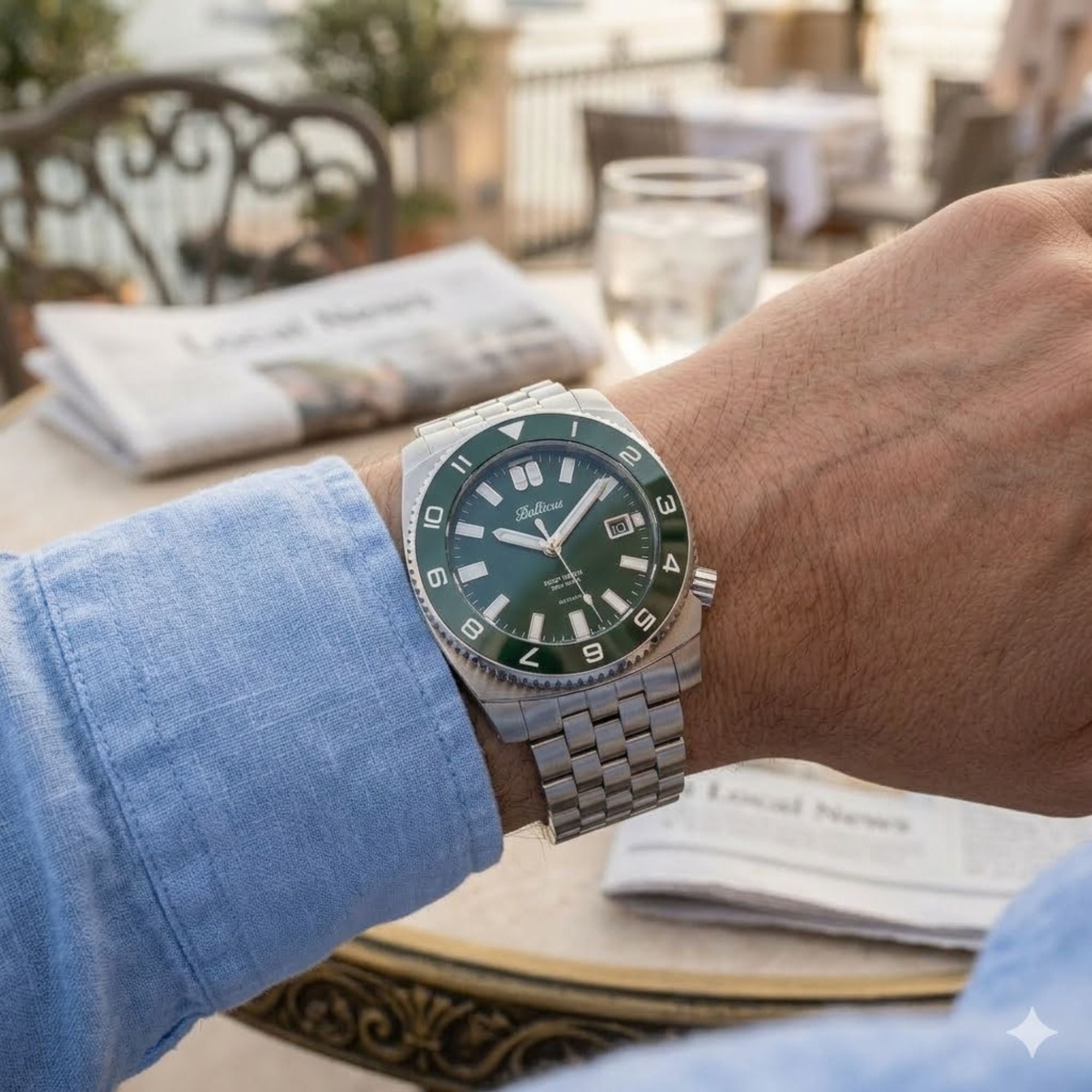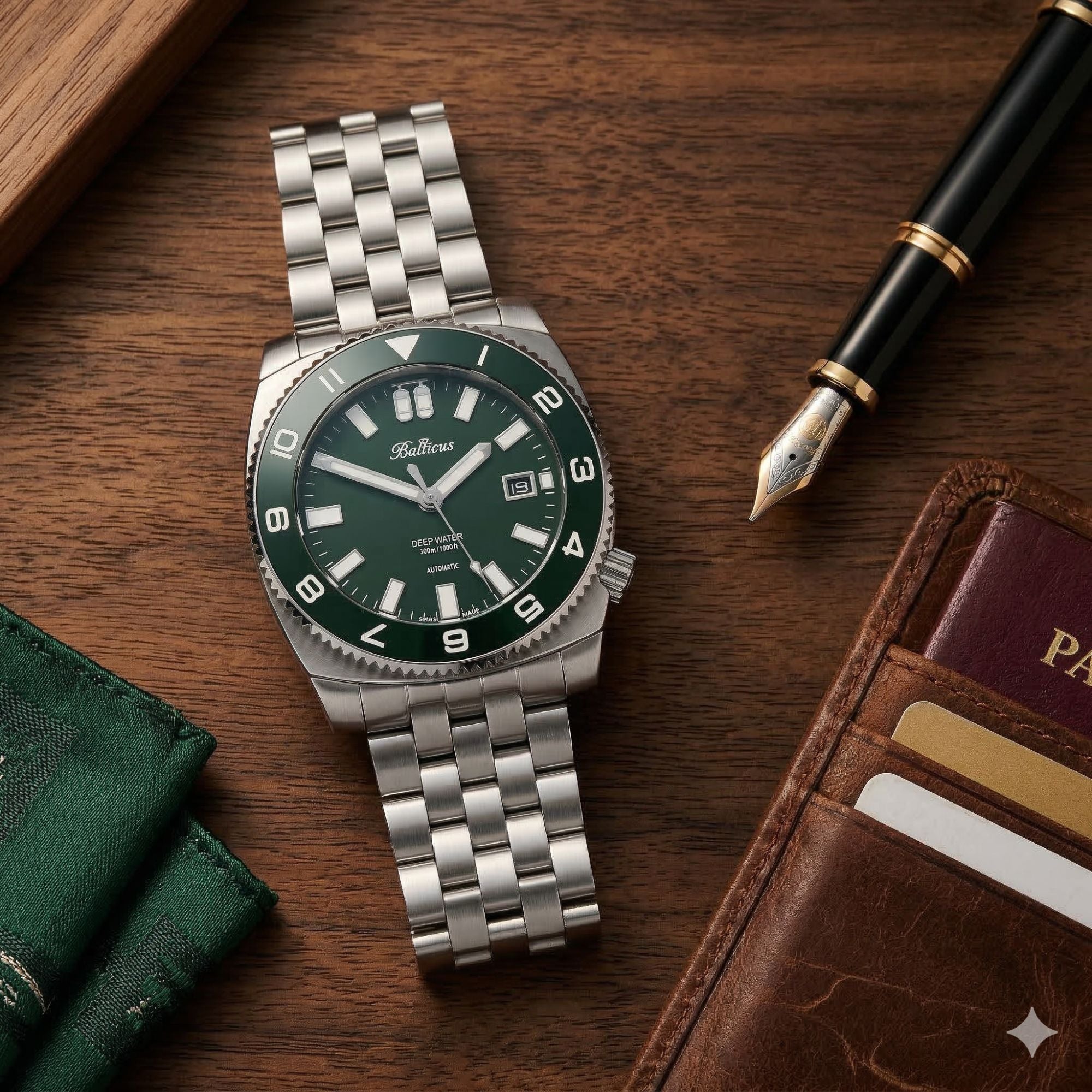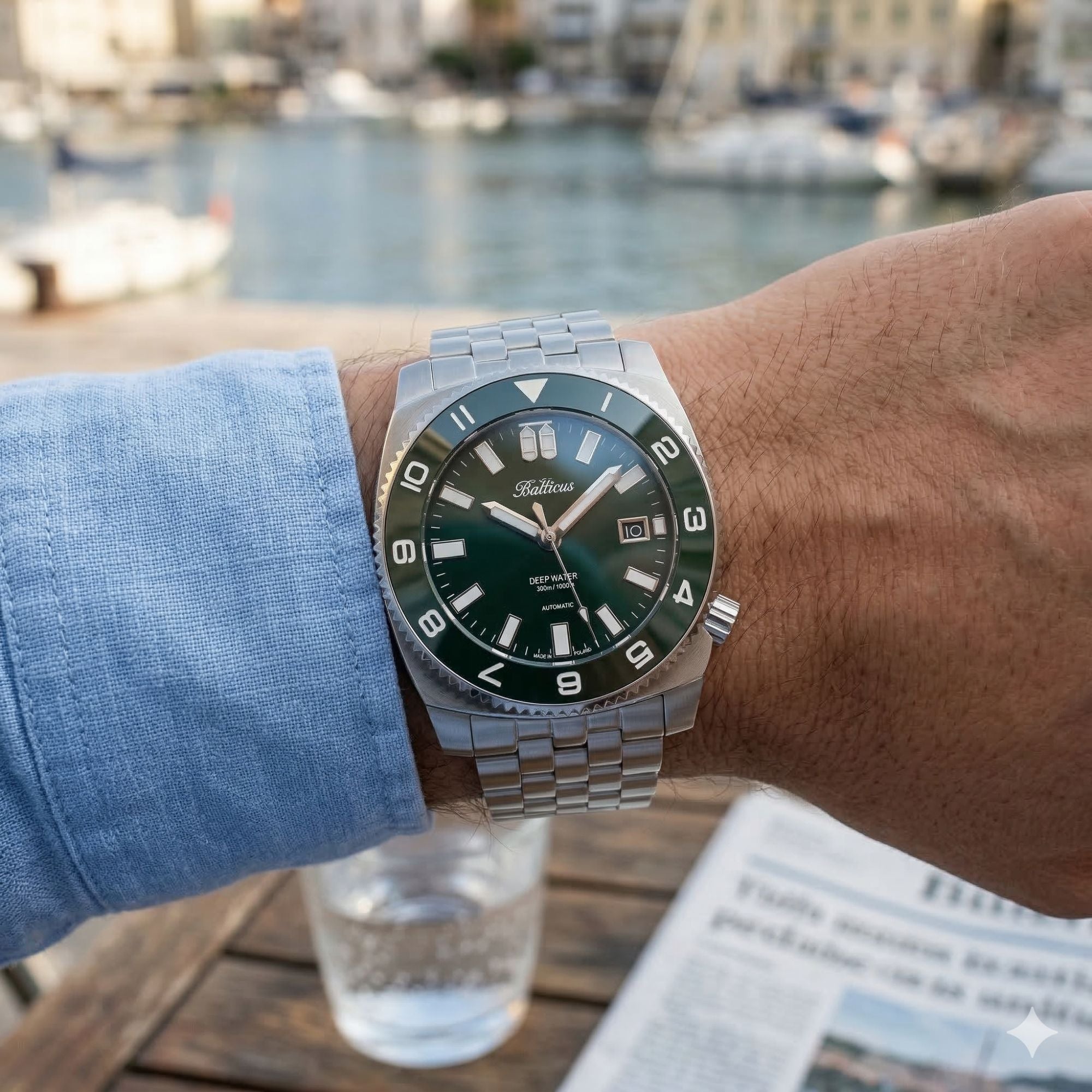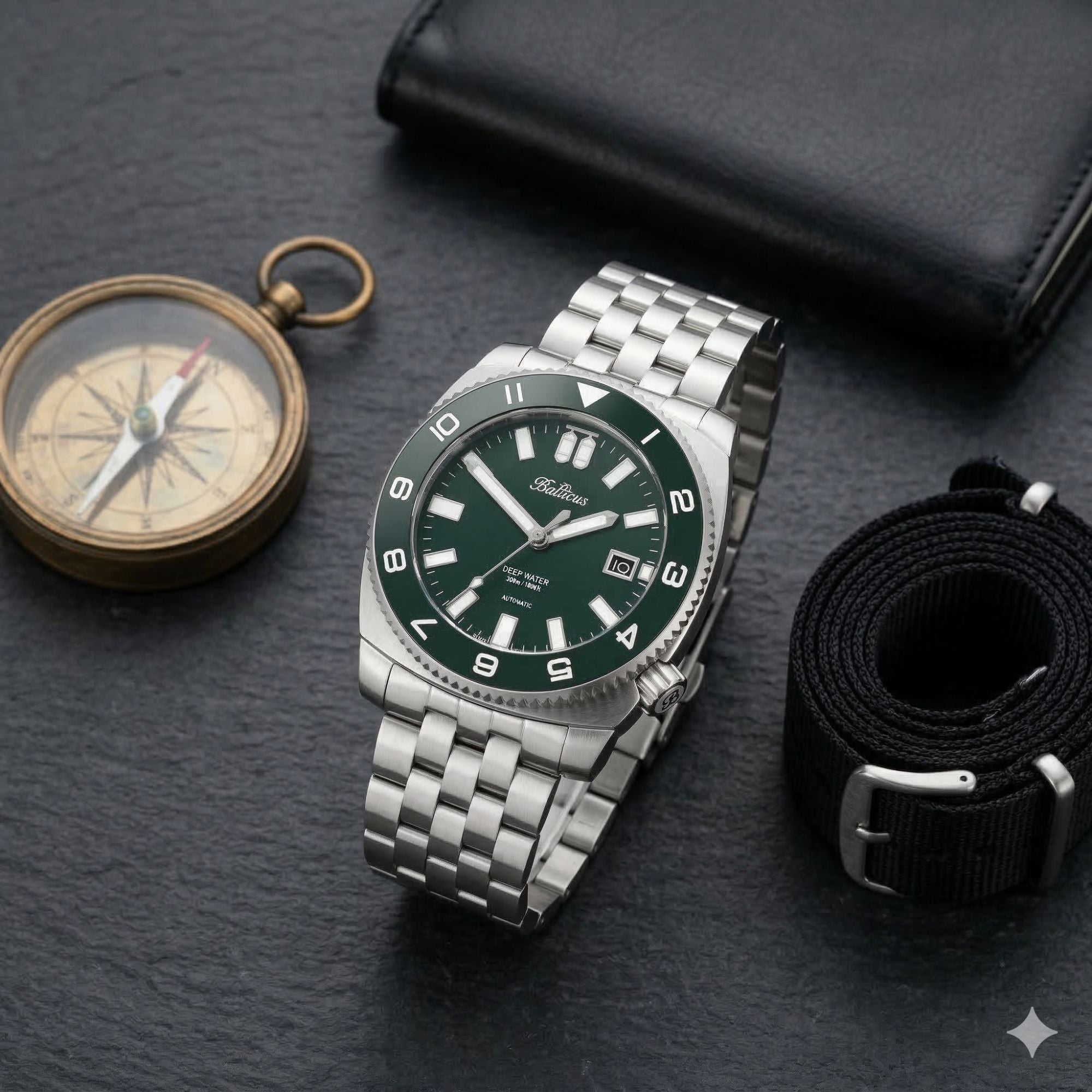 Cyferblat Deep Water BAL-DWRG posiada piękny zielony kolor, identyczny jakim pokryto ceramiczną wkładkę karbowanego bezela. Dodatkową komplikacją, w którą wyposażono zegarek jest wskazanie daty. Okno datownika zostało wykończone polerowaną na wysoki połysk ramką i umieszczone na godzinie 3. Szczególną cechą identyfikującą czasomierze z serii Deep Water są dwie butle tlenowe, które trafiły na tarczę w miejsce godziny 12. To wyjątkowe rozwiązanie, z którego jesteśmy niezwykle dumni. Podkreśla ono indywidualny charakter zegarka. Jest to ukłon w stronę naszych klientów, którzy doceniają detale i smaczki dizajnerskie w naszych zegarkach.
