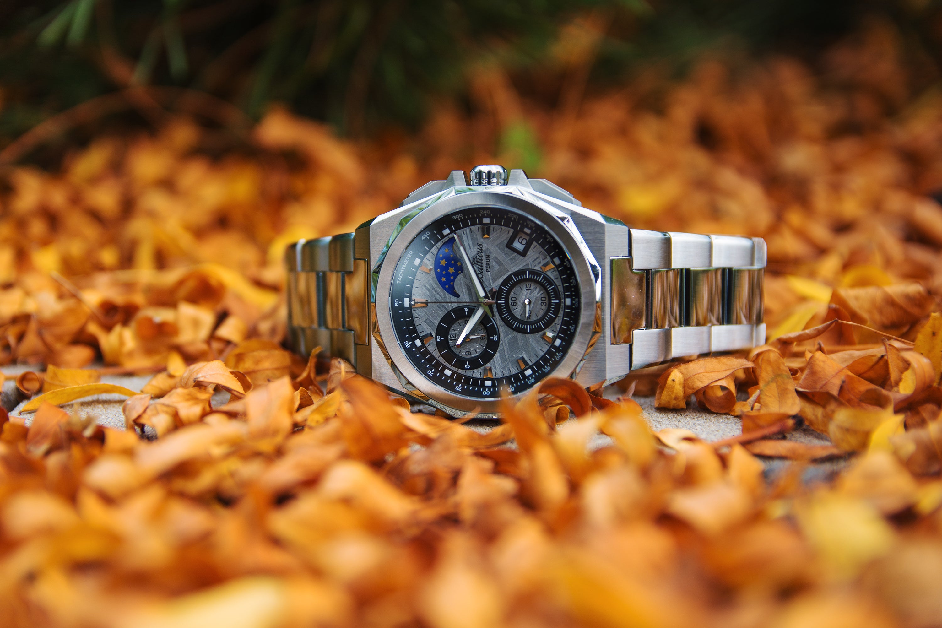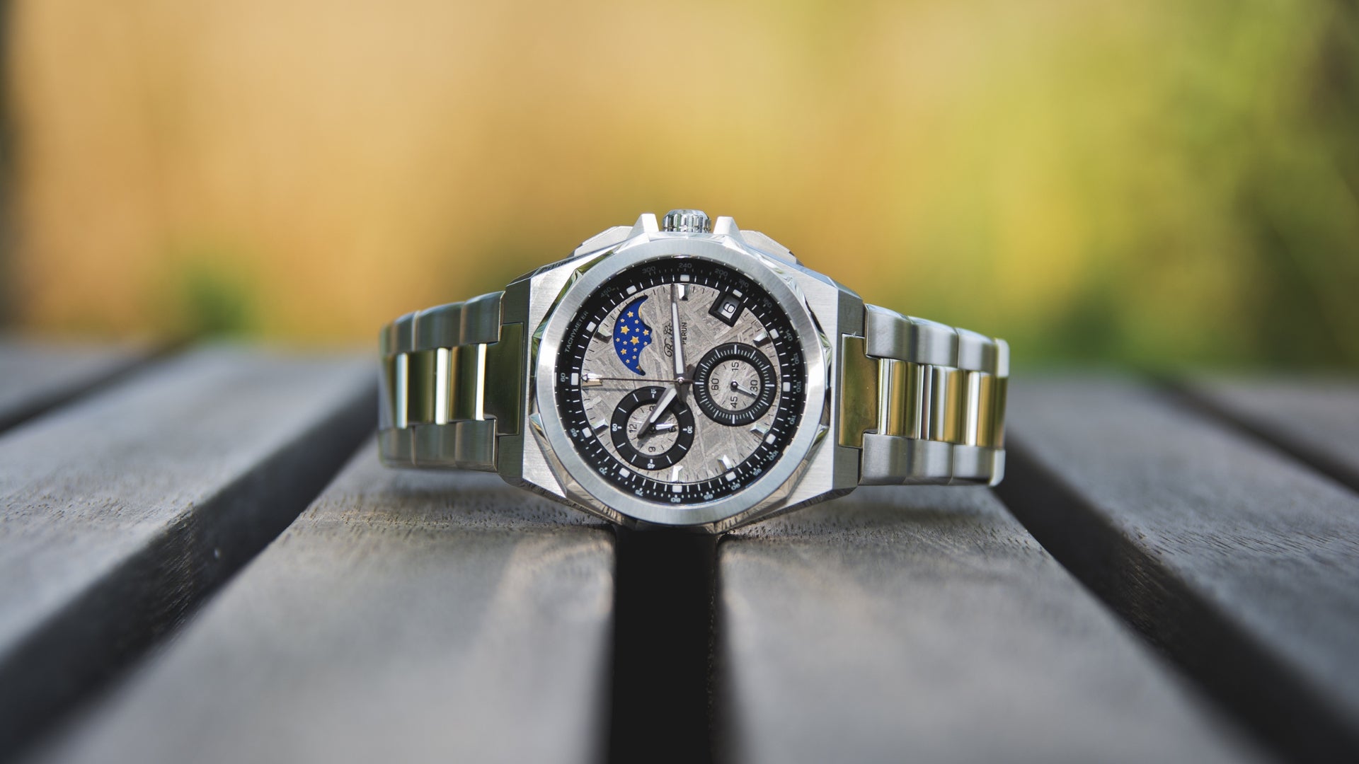 Centralnym elementem zegarka jest tarcza wykonana z naturalnego meteorytu. Charakterystyczne wzory oktaedrytu sprawiają, że każdy model jest absolutnym unikatem. Kompozycję uzupełniają: skala tachometru, datownik, wskaźnik faz Księżyca oraz liczniki chronografu umożliwiające pomiar czasu do niemal 12 godzin.
