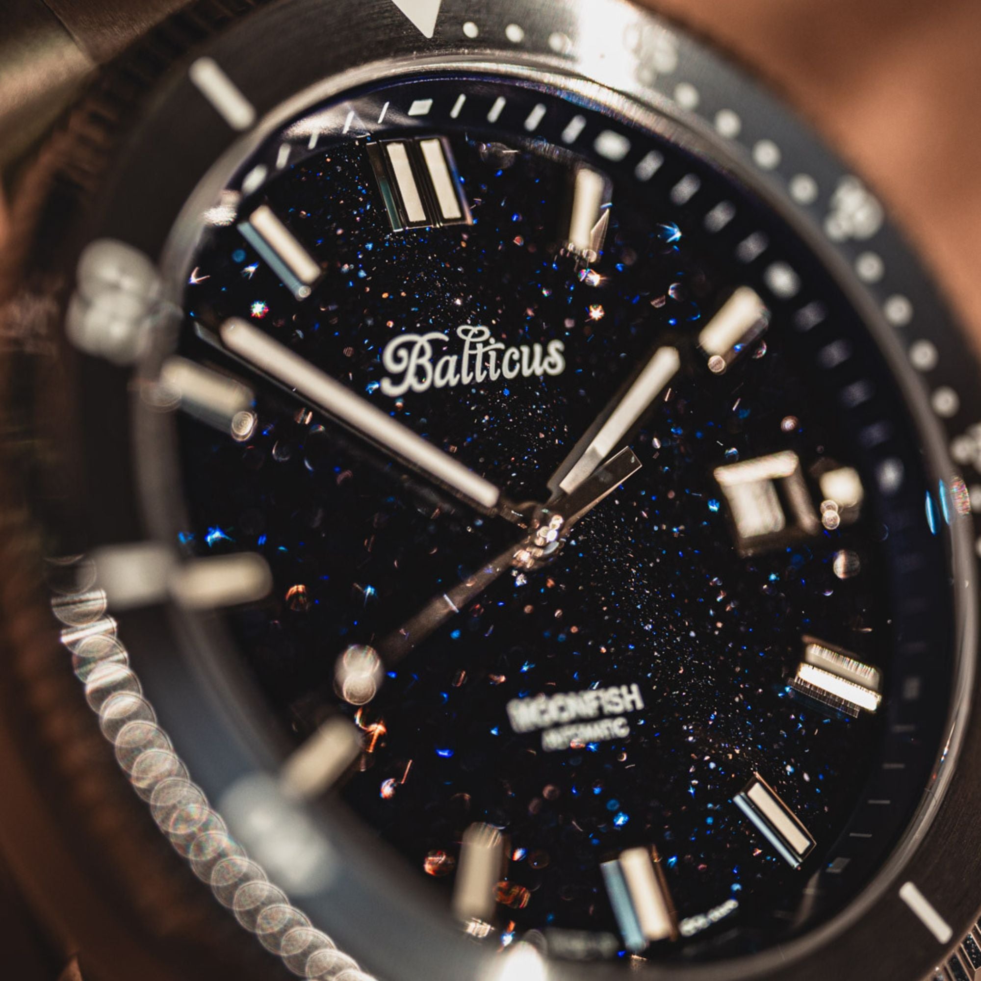 The Moonfish is a watch that loves light. All its key elements were designed to reveal its true colors in the sunlight. The watch's dial is made of natural aventurine. This stone, in the light, shimmers with thousands of stars, reminiscent of a luminous summer night sky. Together with the precisely finished bezel, it emphasizes the watch's jewelry-like character. Fans of Balticus's design will also appreciate the crown. On its top, the letter "B" is filled with Swiss Super-LumiNowa X1 luma. This substance, which is easily activated, illuminates the entire watch with a pleasant blue light. The hands, indices, and numerals on the bezel insert are filled with luma. The luminous substance used is among the world's leading and is used by the most renowned watch manufacturers. Swiss Super-LumiNowa X1 illuminates not only the watch but also the immediate surrounding area. A characteristic feature of this substance is its durability.